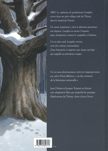 1843. Le capitaine de gendarmerie Langlois arrive dans un petit village isolé des Trièves, dans les massifs alpins. Un tueur mystérieux y sévit et plusieurs personnes ont disparu. Langlois va mener l'enquête pour, assez vite, trouver le coupable et l'abattre. Un an plus tard, Langlois revient, cette fois comme commandant d'une louveterie et organise à ce titre une chasse au loup qui rappelle sa précédente traque. Il s'installe au village, se marie, avant de se suicider en fumant un bâton de dynamite. Un roi sans divertissement (1947), écrit en vingt-sept jours par Jean Giono, est, selon Pierre Michon, "un des sommets de la littérature universelle". 50 ans après la disparition du grand écrivain, Jean Dufaux et Jacques Terpant lui rendent hommage avec une adaptation libre qui magnifie les paysages flamboyants du Trièves, chers à l'auteur.
