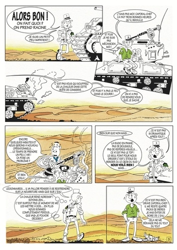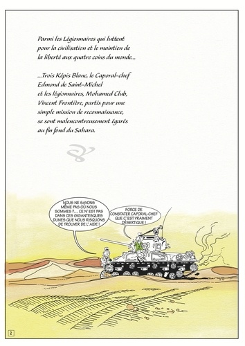 Perdus dans le désert depuis trop longtemps... trois légionnaires vont faire d'étranges découvertes sans se rendre compte de leur importance, tant ils sont obnubilés par le besoin de retourner à leur base. Un trait superbe, rehaussé de quelques touches de couleurs subtiles, des textes riches et travaillés vous mèneront dans ce long récit teinté d'humour. Une BD décalée dans le temps par son récit mais aussi par son style qui rappelle les premiers albums des Tuniques Bleues.