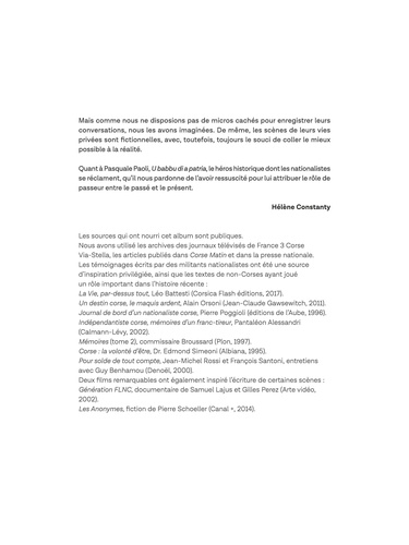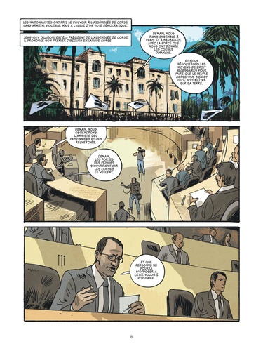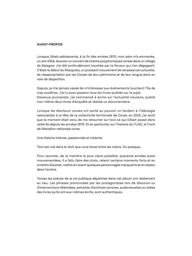 Lors des élections territoriales en 2015, l'assemblée corse assiste pour la première fois à la victoire d'une liste nationaliste qui réunit plusieurs groupes autonomistes. Un coup de tonnerre qui ne relève en rien du hasard et qui réveille un sentiment profond d'identité corse qui s'est construit, souvent dans la violence, depuis bien longtemps. Sous le trait efficace de Benjamin Adès, la journaliste Hélène Constanty revient sur ces événements et raconte, sous forme d'un véritable documentaire, les principales étapes qui ont abouti à cette situation - dont l'assassinat du préfet Erignac en 1998 - sur fond de règlements de comptes et de dérives parfois mafieuses d'un mouvement incontrôlable et lui-même divisé, le FLNC.