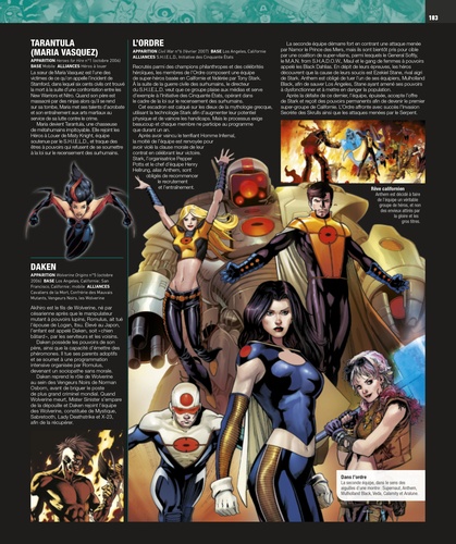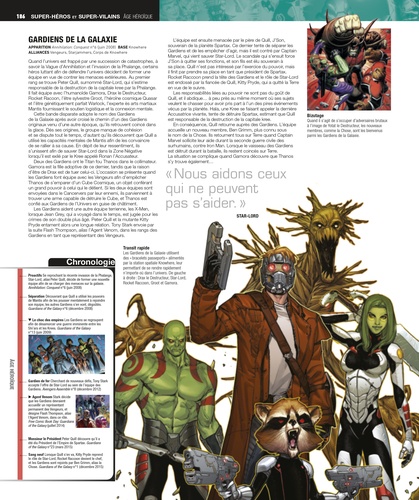 Ce guide ultime définitif de l'univers Marvel présente, dans l'ordre chronologique, tous les personnages, lieux, véhicules et armes des comics. Embarquez pour un voyage enrichissant aux côtés des premiers grands héros Marvel, des méchants et des personnages mythiques des années 1940 et 1950. Poursuivez votre découverte avec les Super-héros emblématiques et les super-vilains de l'époque Marvel des années 1960 et au-delà, comme Thor, Hulk, Spiderman, Black Widow, Docteur Strange, Iron Man, les Avengers, Tornade, Loki et le Bouffon Vert. D'autres sections présentent les véhicules et les technologies clés, les artefacts magiques, les planètes, les pays et les lieux, ainsi qu'un aperçu des coulisses des processus et des techniques de création des comics Marvel. Cet ouvrage richement illustré bénéficie d'une illustration de couverture réalisée par le talentueux dessinateur, Adi Granov.