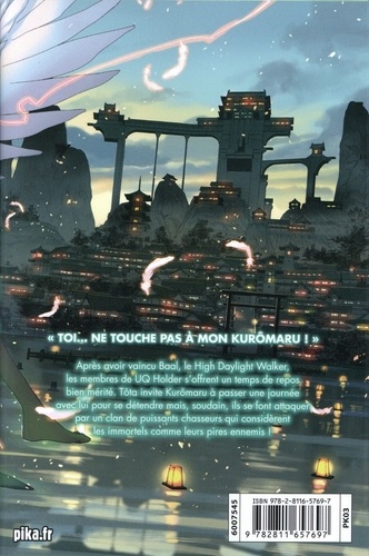 "Toi... ne touche pas à mon kurômaru ! " Après avoir vaincu Baal, le High Daylight Walker, les membres de l'UQ Holder s'offrent un temps de repos bien mérité. Tôta invite Kurômaru à passer une journée avec lui pour se détendre mais, soudain, ils se font attaquer par un clan de puissants chasseurs qui considèrent les immortels comme leurs pires ennemis !