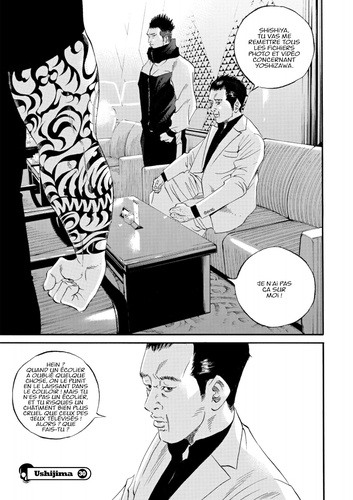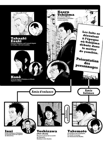 Sur les pas d'Ushijima, un "encaisseur" qui travaille pour le compte des yakuzas, le lecteur rencontrera une série de personnages tombés dans la déchéance du surendettement. Au travers de ces destinées toutes plus tragiques les unes que les autres, c'est un portrait original de la "société d'en bas" que l'on découvre dans ce manga avec, par exemple, une jeune fille ne résistant pas à la pression sociale et se ruinant en vêtements de luxe ou un joueur invétéré et obsessionnel qui y laisse sa chemise et même plus, etc. Ushijima, l'usurier de l'ombre est un manga vraiment étonnant ! On rentre dans un univers très noir où les yakuzas règnent en maîtres, où blanchiment d'argent et combines en tout genre fleurissent dans un univers urbain décalé. Shohei Manabe fait partie des auteurs les plus prometteurs de la jeune génération de mangakas. Son style reconnaissable entre tous, avec un trait incisif, chargé d'encre est fascinant. Le style que ce soit du dessin ou des histoires présente un curieux mélange entre expressionnisme et western. La facilité de Shohei Manabe à restituer sa fascination pour la violence et la noirceur de l'âme humaine sans se perdre dans le propos en fait un des grands auteurs de roman noir graphique.