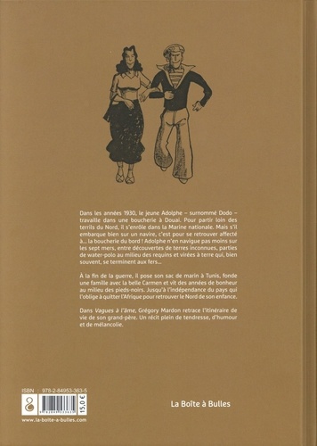Dans les années 1930, le jeune Adolphe — surnommé Dodo — travaille dans une boucherie à Douai. Pour partir loin des terrils du Nord, il s'enrôle dans la Marine nationale. Mais s'il embarque bien sur un navire, c'est pour se retrouver affecté à... la boucherie du bord ! Adolphe n'en navigue pas moins sur les sept mers, entre découvertes de terres inconnues, parties de water-polo au milieu des requins et virées à terre qui, bien souvent, se terminent aux fers... A la fin de la guerre, il pose son sac de marin à Tunis, fonde une famille avec la belle Carmen et vit des années de bonheur au milieu des pieds-noirs. Jusqu'à l'indépendance du pays qui l'oblige à quitter l'Afrique pour retrouver le Nord de son enfance. Dans Vagues à l'âme, Grégory Mardon retrace l'itinéraire de vie de son grand-père. Un récit plein de tendresse, d'humour et de mélancolie.