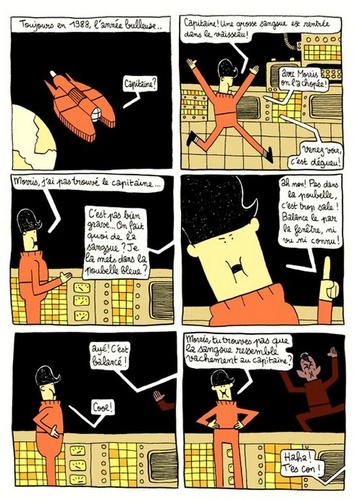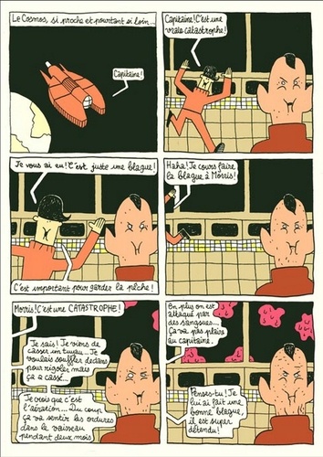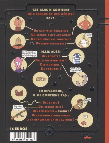 Cet album contient de l'espace et des héros ! Dont : Un capitaine audacieux, Un second assez audacieux, Un troisième pas audacieux, Du faire-valoir sexy. Mais aussi Des robots ! Des extraterrestres ! Des monstres ! Du fromage ! En revanche, il ne contient pas : Des chats ! Des terroristes ! Des références à tintin ! Des revendications quant à la rémunération des auteurs !