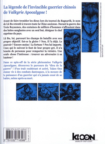 La légende de l'invincible guerrier chinois de Valkyrie Apocalypse ! Avant de faire trembler les dieux lors du tournoi du Ragnarök, le nom de Lü Bu retentit à travers toute la Chine ancienne. Durant la guerre des Trois Royaumes, des centaines de milliers d'hommes s'affrontent dans des luttes sanglantes avec un seul but, désigner le chef suprême du pays. Lü Bu, lui, parcourt les champs de bataille avec son propre objectif. Est-ce la gloire ? Non, il l'a déjà. Le pouvoir ? Encore moins ! La fortune ? Peu lui importe. Ceux qui le suivent le font de leur propre gré, il n'a besoin de personne pour remporter la victoire. Une seule chose l'intéresse : trouver un adversaire à sa hauteur ! Dans ce spin-off de la série phénomène Valkyrie Apocalypse, découvrez le parcours du "dieu de la guerre' ! D'un trait exubérant et acéré, Takeo Ono donne vie à des combats dantesques, à la mesure de la puissance d'un guerrier qui n'a jamais cessé de se battre, même après sa mort.