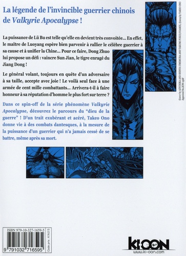 La légende de l'invincible guerrier chinois de Valkyrie Apocalypse ! Avant de faire trembler les dieux lors du tournoi du Ragnarok, Lü Bu a fait retentir son nom à travers la Chine ancienne. Durant la Guerre des trois royaumes, des centaines de milliers d'hommes s'affrontent dans des luttes sanglantes avec un seul but : désigner le chef suprême du pays. Lü Bu, lui, parcourt les champs de bataille avec son propre objectif. Est-ce la gloire ? Non, il l'a déjà. La fortune ? Peu lui importe l'argent. Le pouvoir ? Encore moins ! Ceux qui le suivent le font de leur propre gré, il n'a besoin de personne pour remporter la victoire. Une seule chose l'intéresse : trouver un adversaire à sa hauteur ! Dans ce spin-off de la série-phénomène Valkyrie Apocalypse, découvrez le parcours du " dieu de la guerre "! D'un trait exubérant et acéré, Takeo Ono donne vie à des combats dantesques, à la mesure de la puissance d'un invincible guerrier qui n'a jamais cessé de se battre, même après la mort.