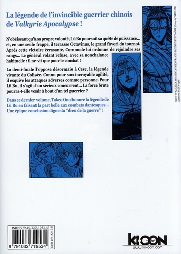La légende de l'invincible guerrier chinois de Valkyrie Apocalypse ! N'obéissant qu'à sa propre volonté, Lü Bu poursuit sa quête de puissance... et, en une seule frappe, il terrasse Octavinus, le grand favori du tournoi. Après cette victoire écrasante, Commode lui ordonne de rejoindre ses rangs... Le général volant refuse, avec sa nonchalance habituelle : il ne vit que pour le combat ! La demi-finale l'oppose désormais à Cesc, la légende vivante du Colisée. Connu pour son incroyable agilité, il esquive les attaques adverses comme personne. Pour Lü Bu, il s'agit d'un sérieux concurrent... La force brute pourra-t-elle venir à bout d'un tel guerrier ? Dans ce dernier volume, Takeo Ono honore la légende de Lü Bu en faisant la part belle aux combats dantesques... Une épique conclusion digne du "dieu de la guerre' !