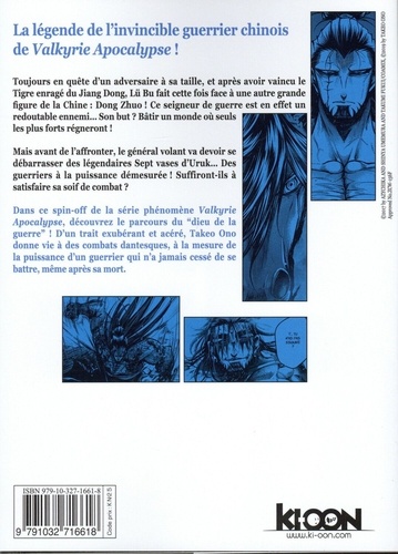 La légende de l'invincible guerrier chinois de Valkyrie Apocalypse ! Toujours en quête d'un adversaire à sa taille, et après avoir vaincu le Tigre enragé du Jiang Dong, Lü Bu fait cette fois face à une autre grande figure de la Chine : Dong Zhuo ! Ce seigneur de guerre est en effet un redoutable ennemi... Son but ? Bâtir un monde où seuls les plus forts régneront ! Mais avant de l'affronter, le général volant va devoir se débarrasser des légendaires Sept vases d'Uruk... Des guerriers à la puissance démesurée ! Suffiront-ils à satisfaire sa soif de combat ? Dans ce spin-off de la série phénomène Valkyrie Apocalypse, découvrez le parcours du "dieu de la guerre" ! D'un trait exubérant et acéré, Takeo Ono donne vie à des combats dantesques, à la mesure de la puissance d'un guerrier qui n'a jamais cessé de se battre, même après sa mort.