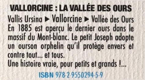 Vallis Ursina - Vallorcine - Vallée des Ours En 1885 est aperçu le dernier ours dans le massif du Mont-blanc. Le petit Joseph adopte un ourson orphelin qu'il protège envers et contre tout... et tous. Une histoire vraie, pour petits et grands !...
