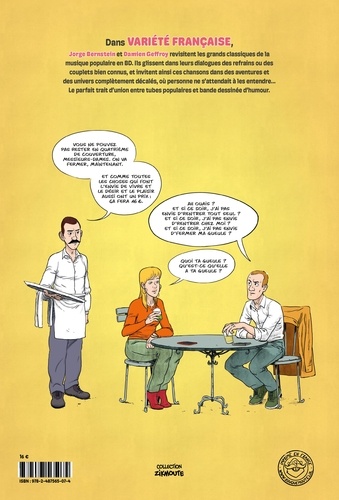 Dans Variété française, Jorge Bernstein et Damien Geffroy revisitent les grands classiques de la musique populaire en BD. Ils glissent dans leurs dialogues des refrains ou des couplets bien connus, et invitent ainsi ces chansons dans des aventures et des univers complètement décalés, où personne ne s'attendait à les entendre... Sur une île, un pirate se met à chanter : "Où sont les femmes ? " A l'école, un instituteur clôt sa dictée par : "Que je t'aime, point." A quai, un marin pêcheur "tape, tape, tape" et le moteur de son chalutier vrombit, prélude d'une nuit de folie dans les déferlantes. Variété française est le parfait trait d'union entre tubes populaires et bande dessinée d'humour. Encore et encore, Allô maman bobo, Il suffira d'un signe, L'homme à la moto, La groupie du pianiste, Babacar, Ne me quitte pas, Place des grands hommes, Nuit de folie, Où sont les femmes, Que je t'aime, Sauver l'amour ou encore Le tirelipimpon... Autant de plaisirs coupables pour nos oreilles, sublimés pour nos yeux par le trait de Damien Geffroy.