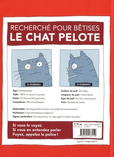 Recherché pour bêtises : le chat Pelote. Age : Préhistorique. Couleur de poil : Gris-bleu. Longueur de poil : 3 kilomètres. Type de poil : De très mauvais poil. Yeux : Boulets de canon. Taille : 188,9 cm (avec la queue). Poids : 37 kilos et 650 grammes. Corpulence : Mammouthesque. Nationalité : Sacré-gouttiéro-birman naturalisé franchachouillard. Profession : Chat domestique malgré lui. Signes particuliers : Se prend pour un tigre géant à dents de sabre. Si vous le voyez, si vous en entendez parler, fuyez, appelez la police !