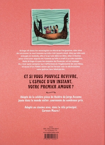Gringa vit dans les montagnes au Nord de l'Argentine. Elle rêve de retrouver le seul homme qu'elle n'ait jamais aimé. Bien qu'elle soit aveugle et malade, elle n'a qu'une idée en tête, aller à Venise pour s'excuser auprès de l'amant qu'elle a trahi il y a des années. Mais Gringa n'a pas les moyens de financer un tel voyage. Or, c'est sans compter sur l'affection et l'ingéniosité de ses filles, et aussi d'un fidèle client qui lui feront voir la Sérénissime sans quitter leur bled perdu. Et si vous pouviez revivre, l'espace d'un instant, votre premier amour ? Adapté de la célèbre de pièce de théâtre de Jorge Accame jouée dans le monde entier, couronnée de nombreux prix. Adapté au cinéma avec, dans le râle principal, Carmen Maura !