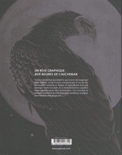 Un rêve graphique aux allures de cauchemar Tout commence par le spectacle du magicien Ciempiés, pour lequel Lucia et Lucia vont participer à l'un de ses incroyables tours. A présent, ils souffrent d'une étrange malédiction : la nuit, ils se transforment en oiseaux monstrueux et énormes. Mais ce n'est que le début du plan du mystérieux magicien... Un plan qui les emmènera dans le sud du pays, où Ciempiés prépare son nouveau spectacle : " la fête nationale du rêve ", qui projette de plonger toute la ville de Puerto Madryn en état de sommeil ! Salvador Sanz, illustrateur argentin célèbre de par le monde pour ses dessins ultraréalistes de villes et ses histoires macabres, telle Legión, livre un récit gothique, aussi horrifique qu'onirique, d'une obscure beauté...