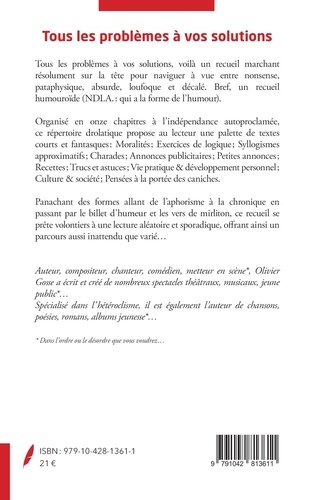 Tous les problèmes à vos solutions, voilà un recueil marchant résolument sur la tête pour naviguer à vue entre nonsense, pataphysique, absurde, loufoque et décalé. Bref, un recueil humouroïde (NDLA. ? : qui a la forme de l'humour). Organisé en onze chapitres à l'indépendance autoproclamée, ce répertoire drolatique propose au lecteur une palette de textes courts et fantasques ? : Moralités ? ; Exercices de logique ? ; Syllogismes approximatifs ? ; Charades ? ; Annonces publicitaires ? ; Petites annonces ? ; Recettes ? ; Trucs et astuces ? ; Vie pratique & développement personnel ? ; Culture & société? ; Pensées à la portée des caniches. Panachant des formes allant de l'aphorisme à la chronique en passant par le billet d'humeur et les vers de mirliton, ce recueil se prête volontiers à une lecture aléatoire et sporadique, offrant ainsi un parcours aussi inattendu que varié...