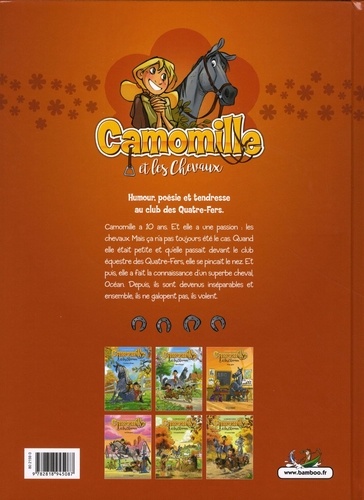 Camomille a 10 ans. Et elle a une passion : les chevaux. Mais ça na pas toujours été le cas. Quand elle était petite et qu'elle passait devant le club équestre des Quatre-Fers, elle se pinçait le nez. Et puis, elle a fait la connaissance d'un superbe cheval, Océan. Depuis, ils sont devenus inséparables et ensemble, ils ne galopent pas, ils volent.