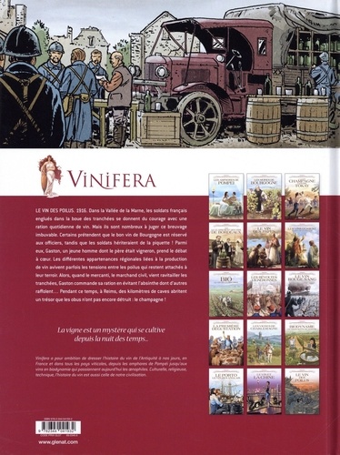 Le vin, un acteur-clé de la vie des soldats dans les tranchées. 1916. Dans la Vallée de la Marne, les soldats français englués dans la boue des tranchées se donnent du courage avec une ration quotidienne de vin. Mais ils sont nombreux à juger ce breuvage imbuvable. Certains prétendent que le bon vin de Bourgogne est réservé aux officiers, tandis que les soldats hériteraient de la piquette ! Parmi eux, Gaston, un jeune homme dont le père était vigneron prend le débat à coeur. Les différentes appartenances régionales liées à la production de vin avivent parfois les tensions entre les poilus qui restent attachés à leur terroir. Alors, quand le mercanti, le marchand civil, vient ravitailler les tranchées, Gaston commande sa ration en évitant l'absinthe dont d'autres raffolent... Pendant ce temps, à Reims, des kilomètres de caves abritent un trésor que les obus n'ont pas encore détruit : le champagne ! La collection s'agrandit avec un album qui revisite l'histoire viticole de la France, prise dans la tourmente de la Grande Guerre de 14-18. Une période noire pour la production au cours de laquelle le marché mondial du vin prend un tournant. Un portrait documenté qui rend hommage à la diversité des cépages et nous rappelle l'effort de guerre des femmes pendant le conflit.
