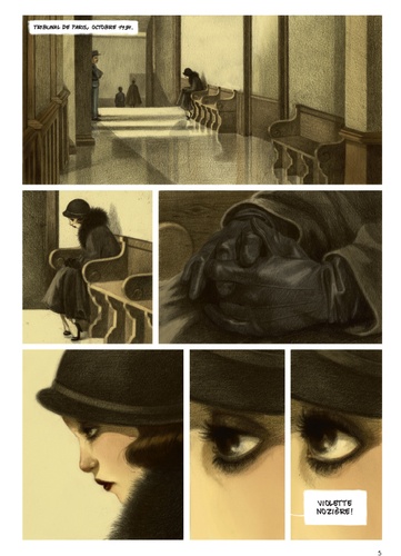 Octobre 1934. Assise sur un banc, noyée dans un immense couloir du Palais de justice de Paris, Violette Nozière, 19 ans, toute de noir vêtue, a les yeux perdus dans le vide. Elle attend que son procès reprenne et songe à ce qui l'a conduit ici. Celle que l'on surnomme alors " l'empoisonneuse de la rue de Madagascar " ou la " parricide monstrueuse " laisse ses pensées remonter le temps... Issue d'un milieu populaire, Violette rêvait d'une autre existence. Mais, rétive au travail comme aux études, elle préférera la vie facile. Prostitution, fêtes, mais aussi mensonges à répétition, manipulation et vol de ses propres parents, jusqu'au point de non-retour : elle finit par les empoisonner. Fait divers scandaleux, le crime de Violette Nozière a secoué la France des années trente, et son procès retentissant est resté l'une des plus célèbres affaires judiciaires de l'époque. Pour traiter de ce parcours de vie exceptionnel, déjà évoqué au cinéma par Claude Chabrol ou en littérature par les surréalistes, le tandem Camille Benyamina / Eddy Simon a préféré laisser de côté l'aspect policier et judiciaire pour se concentrer sur un étonnant portrait de jeune fille, parfois poétique, parfois mystérieux. De quoi nous rendre presque attachante cette personnalité pourtant volage, frivole, inconséquente, manipulatrice, et poser la question du poids de la psychiatrie dans les parcours criminels. Le récit proprement dit est prolongé par un dossier de 8 pages illustré de photos d'archives.