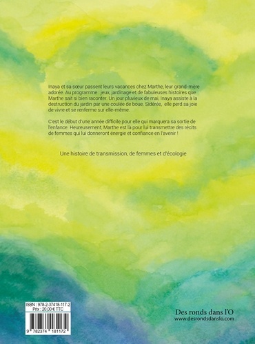 Inaya et sa soeur passent leurs vacances chez Marthe, leur grand-mère adorée. Au programme : jeux, jardinage et de fabuleuses histoires que Marthe sait si bien raconter. Un jour pluvieux de mai, Inaya assiste à la destruction du jardin par une coulée de boue. Sidérée, elle perd sa joie de vivre et se renferme sur elle-même. C'est le début d'une année difficile pour elle qui marquera sa sortie de l'enfance. Heureusement, Marthe est là pour lui transmettre des récits de femmes qui lui donneront énergie et confiance en l'avenir ! Une histoire de transmission, de femmes et d'écologie.