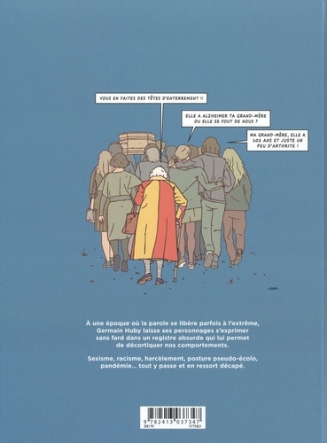 "Vivons décomplexés" annonce la couleur d'emblée, dès son titre. Sexisme, racisme, harcèlement, imposture, info continue, fossé entre générations, pandémie... tout y passe et en ressort décapé, parfois jusqu'à l'os. Les filtres de la bienséance se brisent en éclat pour laisser passer un rire libérateur. Le tout est habillé d'un dessin réaliste qui vient appuyer l'incongruité des situations.