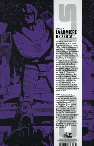 Darak et Solila sont parvenus à mettre leurs différences derrière eux et, avec l'aide du Transformer Springer, à lever le voile sur un complot qui dépasse tout ce qu'ils auraient pu imaginer. Mais pour mieux le défaire, ils n'auront d'autre choix que de se séparer, et de tracer leur propre voie... Darak, de retour sur Agorria, voit sa loyauté mise à l'épreuve, tandis que Solila s'enfonce au coeur de l'Interzone pour tenter de percer les mystères de Zerta. Alors que de mystérieux vaisseaux approchent de l'Anneau Sacré, les deux anciens seront-il capables rivaux la réunification, avant que la guerre n'éclate pour de bon ? Avec Void rivals, le légendaire Robert Kirkman (The Walking Dead, invincible) pose la première pierre d'un space opera épique, brillamment illustré par Lorenzo De Felici (Kroma, Oblivion Song). Ensemble, ils tissent une saga de SF grandiose portée par deux personnages aussi charismatiques qu'attachants, où chaque chapitre est construit avec brio pour tenir le lecteur en haleine .