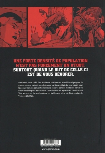 La démographie est un atout. Sauf quand votre propre population veut vous dévorer. New Dehli, Inde, 2025. Des hordes de zombies ont envahi la mégalopole, le gouvernement est retranché dans un bunker assiégé. Le seul espoir pour la population : un convoi humanitaire escorté par des militaires partis du Baluchistan pour les secourir. 1 350 kilomètres à parcourir. Le désert du Thar à traverser. Un seul poste de ravitaillement sécurisé. Et des nuées de Voraces à l'affût... Christophe Bec et Stefano Landini revisitent le récit de zombie et nous plongent au coeur de la des contrées mystérieuses et fascinantes de l'Inde. Voraces, c'est World War Z au pays de Bollywood... mais sans happy end !
