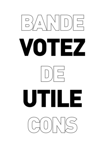 Coédition Marwanny / Imprimerie Trace, Votez utile (bande de cons) est une collection de cartes subliminales détournant des slogans politiques. Utilisant le procédé de la typographie (ou « letterpress »), le texte des slogans est imprimé en noir, tandis que les textes de détournement sont uniquement « gaufrés » (impression sans encre), en creux dans le papier, n'apparaissant que lorsque l'on se rapproche du visuel.