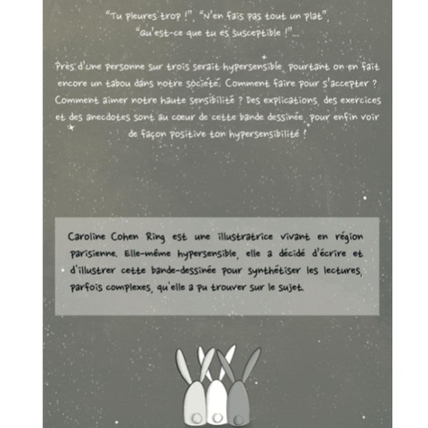 Pas toujours facile de parler d'hypersensibilité, tantôt sujet méconnu, tantôt sujet à la mode... On se perd un peu dans toutes ces informations et ces non-dits. Heureusement, Caroline Cohen Ring a fait le tri pour vous. Voilà deux années qu'elle travaille avec passion sur ce thème, et elle vous propose de découvrir aujourd'hui sa bande dessinée de plus de 140 pages sur l'hypersensibilité ! Vous trouverez dans cette BD : Des informations pertinentes et documentées sur l'hypersensibilité. Des exemples de tous les jours pour s'identifier facilement. Un test pour savoir si vous êtes hypersensible. Elaboré par Elodie Crepel (spécialiste du sujet et codirigeante de l'observatoire de la sensibilité). Et surtout une manière de voir la sensibilité positivement ! Et une préface du Docteur Saverio Tomasella. Cette BD va vous rassurer sur ce que vous ressentez mais aussi sur ce que vous vivez dans votre quotidien. Elle va vous permettre de comprendre les relations sociales, de mieux vivre les interactions, de pouvoir communiquer sur votre sensibilité et de vous faire accepter tel.le que vous êtes (que ce soit dans le milieu personnel comme professionnel). Avec des outils concrets mais aussi de manière très ludique, cette BD vous permettra de voir votre sensibilité autrement.