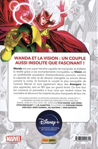 Wanda et la Vision : un couple aussi insolite que fascinant ! Wanda est une super-héroïne capable de manipuler et d'altérer la réalité grâce à ses enchantements incroyables. La Vision est un synthézoïde possédant d'extraordinaires pouvoirs, comme la capacité de voler et de devenir intangible ou encore dense comme la roche. Ils forment le couple le plus incroyable de l'univers Marvel et sont également deux des Avengers les plus appréciés, tant en BD que sur grand écran. Ce livre leur est consacré et permettra à tous ceux qui veulent mieux les connaître et découvrir les instants les plus marquants de leur vie. Cet album contient les episodes Avengers Origins : Vision (2011) 1, La premiere histoire de Giant-size Avengers (1974) 4, ainsi que Marvel Team-up (1972) 129 et 130 - Ecrits par Kyle Higgins, Alec Siegel, Steve Englehart ET J. M. DeMatteis, et illustrés par Stephane Perger, Don Heck, Kerry Gammill, Sal Buscema et Mike Esposito.
