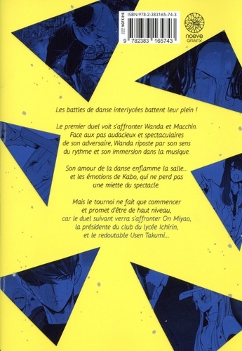 Les battles de danse interlycées battent leur plein ! Le premier duel voit s'affronter Wanda et Macchin. Face aux pas audacieux et spectaculaires de son adversaire, Wanda riposte par son sens du rythme et son immersion dans la musique. Son amour de la danse enflamme la salle... et les émotions de Kabo, qui ne perd pas une miette du spectacle. Mais le tournoi ne fait que commencer et promet d'être de haut niveau, car le duel suivant verra s'affronter On Miyao, la présidente du club du lycée Ichirin, et le redoutable Usen Takumi...