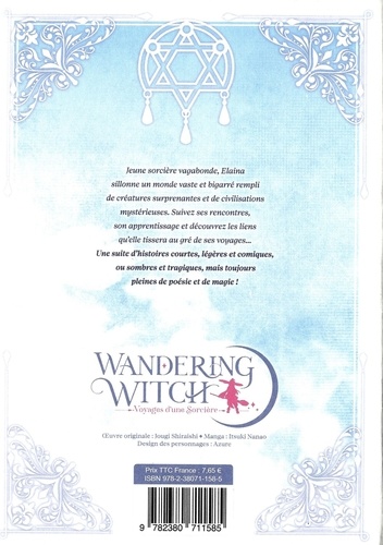 Elaina la sorcière découvre un monde vaste, rempli de mystères... et de dangers ! Jeune sorcière vagabonde, Elaina sillonne un monde vaste et bigarré rempli de créatures surprenantes et de civilisations mystérieuses. Suivez ses rencontres, son apprentissage et découvrez les liens qu'elle tissera au gré de ses voyages... Une suite d'histoires courtes, légères et comiques, ou sombres et tragiques, mais toujours pleines de poésie et de magie !