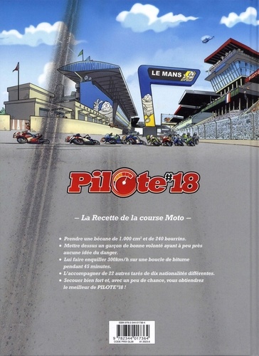 - La Recette de la course Moto - Prendre une bécane de 1000 cm3 et de 240 bourrins. Mettre dessus un garçon de bonne volonté ayant à peu près aucune idée du danger. Lui faire enquiller 300km/h sur une boucle de bitume pendant 45 minutes. L'accompagner de 22 autres tarés de dix nationalités différentes. Secouer bien fort et, avec un peu de chance, vous obtiendrez le meilleur de Pilote#18 !