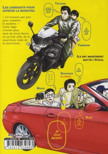 Un monstre est apparu dans l'enceinte du lycée ! Il dévore un humain par jour. Alors, soyons efficaces : débarrassons-nous d'abord des gens inutiles. Découvrez la nouvelle série dérangeante de l'auteur de Detroit Metal City. Coincé dans leur lycée après une attaque mondiale de monstres, un groupe formé des élèves les plus forts, décide de sacrifier un survivant par jour pour apaiser la créature qui les empêche de sortir. Mais alors qu'ils ne sont plus que sept, les rapports de force commencent à changer. La loi du plus fort s'applique-t-elle vraiment ici ?