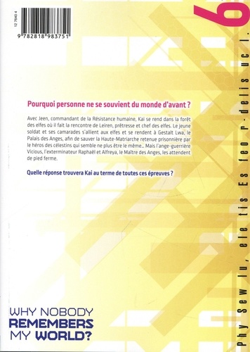 Pourquoi personne ne se souvient du monde d'avant ? Avec Jeen, commandant de la Résistance humaine, Kai se rend dans la forêt des elfes où il fait la rencontre de Leiren, prêtresse et chef des elfes. Le jeune soldat et ses camarades s'allient aux elfes et se rendent à Gestalt Lwa, le Palais des Anges, afin de sauver la Haute-Matriarche retenue prisonnière par le héros des célestins qui semble ne plus être le même... Mais l'ange-guerrière Vicious, l'exterminateur Raphaël et Alfreya, le Maître des Anges, les attendent de pied ferme. Quelle réponse trouvera Kai au terme de toutes ces épreuves ?