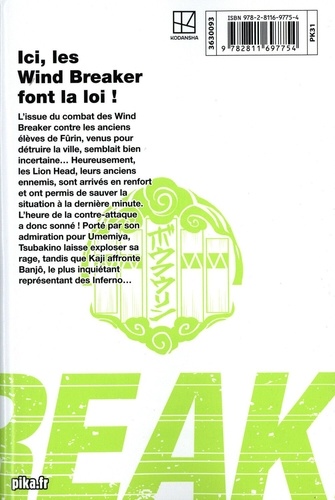 L'issue du combat des Wind Breaker contre les anciens élèves de Fûrin, venus pour détruire la ville, semblait bien incertaine... Heureusement, les Lion Head, leurs anciens ennemis, sont arrivés en renfort et ont permis de sauver la situation à la dernière minute. L'heure de la contre-attaque a donc sonné ! Porté par son admiration pour Umemiya, Tsubakino laisse exploser sa rage, tandis que Kaji affronte Banjô, le plus inquiétant représentant des Inferno...