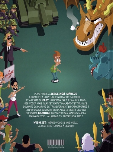 Récapitulons : le jeune Marcus, qui pensait brader son statut de loser en vendant son âme au diable, enchaîne les soucis depuis que Clay, le démon gaffeur censé réaliser ses voeux, est entré dans sa vie. Non seulement Jesslinda, la plus belle fille du lycée, ne veut toujours pas de lui, mais en plus Marcus a embrassé la surveillante générale à la fête de Noël ! Mais tout ça ne serait rien si un terrible démon, Kradoch, ne venait soudain remplacer Clay... Car Kradoch risque bien de pousser Marcus sur la mauvaise voie... au risque de lui faire perdre son âme d'une autre façon... Après un premier tome plein de rebondissements irrésistibles, au service de la construction du duo Marcus/Clay, Ced et Stivo rebattent toutes les cartes pour encore plus de fun et de surprises !