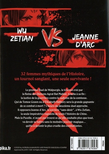 Le premier duel de Walpurgis, le tournoi créé par la Reine des Démons Agrat Bat Mahlat, touche à sa fin : la justice de la guerrière contre le sadisme de la comtesse. Qui de Tomoe Gozen ou d'Elisabeth Báthory sera la grande gagnante de ce combat à mort ? L'heure du deuxième duel approche. Il opposera Jeanne d'Arc, la sorcière "sans désir", à Wu Zetian, la seule impératrice régnante de toute l'histoire de Chine. Mais la Pucelle, n'ayant pas trouvé ce qu'elle souhaite plus que tout, va devoir se battre sans le moindre pouvoir magique... quitte à devenir la plus cruelle des combattantes.