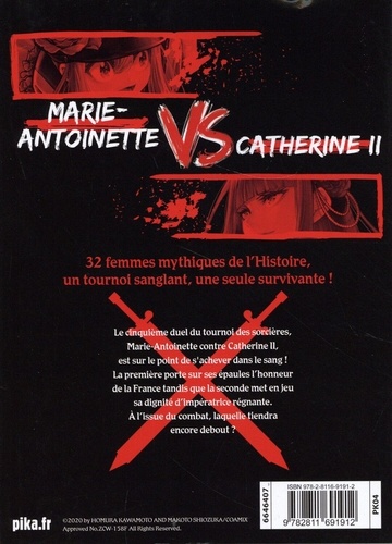 32 femmes mythiques de l'Histoire, un tournoi sanglant, une seule survivante ! Le cinquième duel du tournoi des sorcières, Marie-Antoinette contre Catherine II, est sur le point de s'achever dans le sang ! La première porte sur ses épaules l'honneur de la France tandis que la seconde met en jeu sa dignité d'impératrice régnante. A l'issue du combat, laquelle tiendra encore debout ?