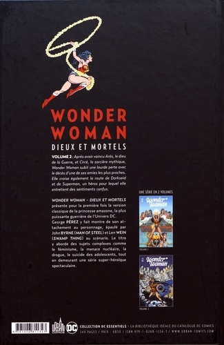 Volume 2 : Après avoir vaincu Arès, le dieu de la Guerre, et Circé, la sorcière mythique, Wonder Woman subit une lourde perte avec le décès d'une de ses amies les plus proches. Elle croise également la route de Darkseid et de Superman, un héros pour lequel elle entretient des sentiments confus. Wonder Woman - Dieux et mortels présente pour la première fois la version classique de la princesse amazone, la plus puissante guerrière de l'Univers DC. George Pérez y fait montre de son attachement au personnage, épaulé par John Byrne (Man of Steel) et Len Wein (Swamp Thing) au scénario. Le titre y aborde des sujets complexes comme le féminisme, la menace nucléaire, la drogue, le suicide des adolescents, tout en demeurant une série super-héroïque spectaculaire.