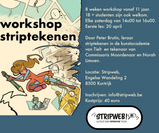 Vanaf 20 april kan je op zaterdagnamiddag bij stripweb in Kortrijk terecht voor 2 uur lang introductie in de mysteries van het striptekenen. Peter Brutin is leraar striptekenen in de kunstacademie van Tielt en maakt je wegwijs in de boeiend wereld van het stripverhaal.
