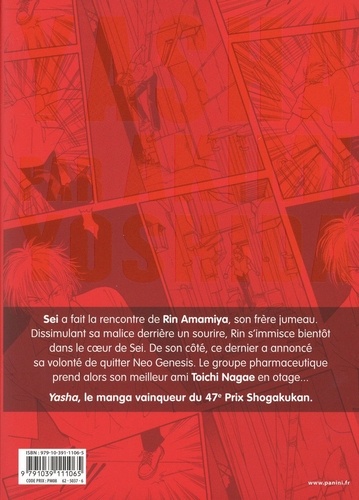 Sei s'est rebellé contre Neo Genesis. Combattant seul les agents de sécurité, il tient bon jusqu'à ce que Toichi soit pris en otage. Cela provoque chez lui une colère qui transforme son visage en celui de Rin. Cette lutte va-t-elle consumer à jamais l'âme de Sei ? Quel est le lien entre ce dernier et Rin ? Tandis que Banana Fish est arrivé à sa conclusion, Panini est heureux de vous proposer une autre oeuvre majeure de l'autrice : Yasha. Récompensée d'un Shogakukan Manga Awards en 2002 pour ce récit, la célèbre mangaka revisite le mythe du Yasha et du Bodhisattva sur fond de réflexion sur la génétique. On retrouve dans ce titre de nombreux thèmes chers à l'autrice qui participent à la singularité de ses oeuvres, comme la parentalité et le passage de l'adolescence à l'âge adulte. Une grande oeuvre à découvrir pour tous les fans de Banana Fish, de science-fiction... ou les deux !