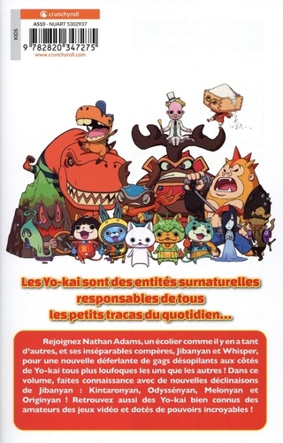 Rejoignez Nathan Adams, un écolier comme il y en a tantd'autres, et ses inséparables compères, Jibanyan et Whisper, pour une nouvelledéferlante degags désopilants aux côtés de Yo-kai tous plus loufoques les uns que les autres ! Dans ce volume, faites connaissance avec de nouvelles déclinaisons deJibanyan : Kintaronyan, Odyssényan, Melonyan et Originyan ! Retrouvez aussi desYo-kai bien connus des amateurs des jeux vidéo et dotés de pouvoirs incroyables !