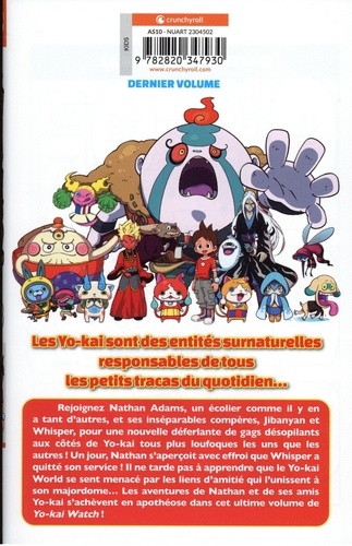 Rejoignez Nathan Adams, un écolier comme il y en a tant d'autres, et ses inséparables compères, Jibanyan et Whisper, pour une nouvelle déferlante de gags désopilants aux côtés de Yo-kai tous plus loufoques les uns que les autres ! Un jour, Nathan s'aperçoit avec effroi que Whisper a quitté son service ! Il ne tarde pas à apprendre que le Yo-kai World se sent menacé par les liens d'amitié qui l'unissent à son majordome... Les aventures de Nathan et de ses amis Yo-kai s'achèvent en apothéose dans cet ultime volume de Yo-kai Watch !