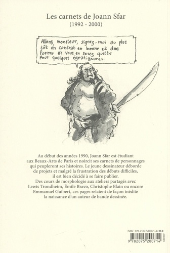 Etudiant aux Beaux-Arts de Paris dans les années 1990, Joann Sfar noircit déjà inlassablement ses carnets à dessin. Stimulé par le vent nouveau et la franche camaraderie qui se dégagent des ateliers qu'il partage avec d'autres auteurs de bande dessinée, comme Christophe Blain ou Emmanuel Guibert, il imagine les contours des personnages qui feront son succès. Mais pour l'heure, il cumule les lettres de refus d'éditeurs. Trente ans plus tard, l'auteur se replonge dans les tranches de vie du jeune Joann, et commente avec amusement et lucidité les pages inédites de ses tout premiers carnets.