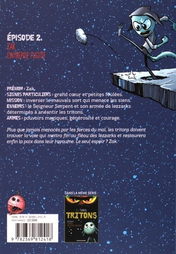 Prénom : Zak. Signes particuliers : grand coeur et petites foulées. Mission : inverser le mauvais sort qui menace les siens. Ennemis : le Seigneur Serpent et son armée de lezzarks déterminés à anéantir les tritons. Armes : pouvoirs magiques, générosité et courage. Plus que jamais menacés par les forces du mal, les tritons doivent trouver la voie qui mettra fin au fléau des lezzarks et restaurera enfin la paix dans leur royaume. Le seul espoir ? Zak.