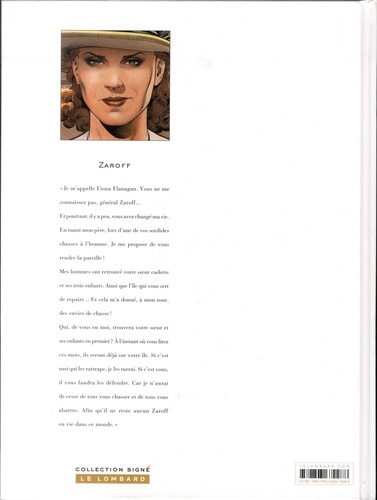 "Je m'appelle Fiona Flanagan. Vous ne me connaissez pas, général Zaroff... Et pourtant, il y a peu, vous avez changé ma vie. En tuant mon père, lors d'une de vos sordides chasses à l'homme. Je me propose de vous rendre la pareille ! Mes hommes ont retrouvé votre soeur cadette et ses trois enfants. Ainsi que l'île qui vous sert de repaire... Et cela m'a donné, à mon tour, des envies de chasse ! Qui, de vous ou moi, trouvera votre soeur et ses enfants en premier ? A l'instant où vous lirez ces mots, ils seront déjà sur votre île. Si c'est moi qui les rattrape, je les tuerai. Si c'est vous, il vous faudra les défendre. Car je n'aurai de cesse de tous vous chasser et de tous vous abattre. Afin qu'il ne reste aucun Zaroff en vie dans ce monde."