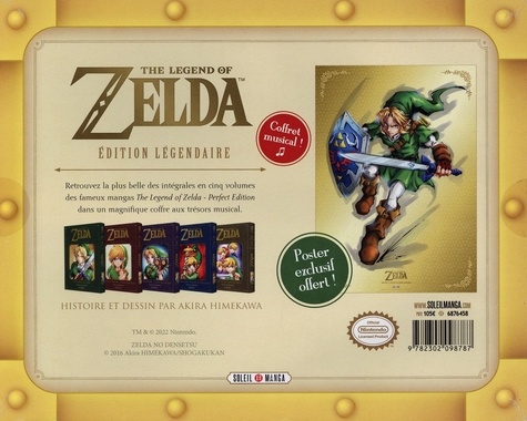 Découvrez ou redécouvrez les éditions prestige des mangas The Legend of Zelda dans un très beau coffre au trésor musical au tirage limité ! Retrouvez la plus belle des intégrales en cinq volumes des fameux mangas The Legend of Zelda - Perfect Edition dans un magnifique coffre au trésor musical. Remarque : Pour que le son du coffret s'enclenche, il faut activer l'interrupteur sous le coffret du couvercle et exposer le coffret à une source de lumière forte.