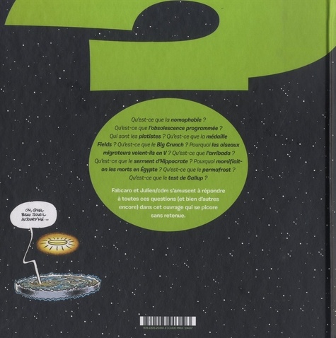 Qu'est-ce que la nomophobie ? Qu'est-ce que l'obsolescence programmée ? Qui sont les platistes ? Qu'est-ce que la médaille Fields ? Qu'est-ce que le Big Crunch ? Pourquoi les oiseaux migrateurs volent-ils en V ? Qu'est-ce que l'arribada ? Qu'est-ce que le serment d'Hippocrate ? Pourquoi momifiait- on les morts en Egypte ? Qu'est-ce que le permafrost ? Qu'est-ce que le test de Gallup ? Fabcaro et Julien/cdm s'amusent à répondre à toutes ces questions (et bien d'autres encore) dans cet ouvrage qui se picore sans retenue.