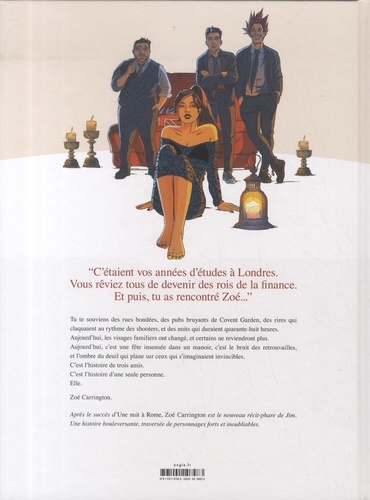 C'étaient vos années d'études à Londres. Vous rêviez tous de devenir des rois de la finance. Et puis, tu as rencontré Zoé... Tu te souviens des rues bondées, des pubs bruyants de Covent Garden, des rires qui claquaient au rythme des shooters, et des nuits qui duraient quarante-huit heures. Aujourd'hui, les visages familiers ont changé, et certains ne reviendront plus. Aujourd'hui, c'est une fête insensée dans un manoir, c'est le bruit des retrouvailles, et l'ombre du deuil qui plane sur ceux qui s'imaginaient invincibles. C'est l'histoire de trois amis. C'est l'histoire d'une seule personne. Elle. Zoé Carrington. Après le succès d'Une nuit à Rome, Zoé Carrington est le nouveau récit-phare de Jim. Une histoire bouleversante, traversée de personnages forts et inoubliables.