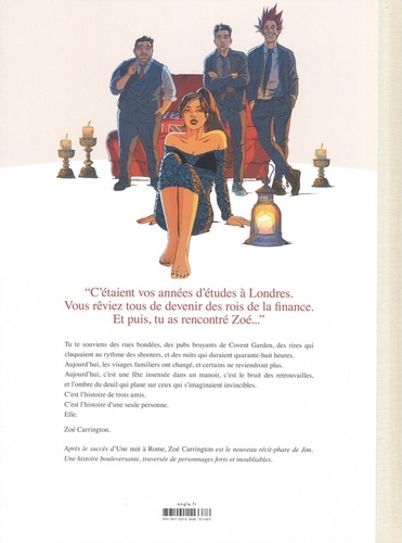 C'étaient vos années d'études à Londres. Vous rêviez tous de devenir des rois de la finance. Et puis, tu as rencontré Zoé... Tu te souviens des rues bondées, des pubs de Covent Garden, des rires qui claquaient au rythme des shooters, et des nuits qui duraient quarante-huit heures. Aujourd'hui, les visages familiers ont changé, et certains ne reviendront plus. Aujourd'hui, c'est une fête insensée dans un manoir, c'est le son des retrouvailles, et l'ombre du deuil qui plane sur ceux qui se croyaient invincibles. C'est l'histoire de trois amis. C'est l'histoire d'une seule personne. Elle. Zoé Carrington. Après le succès d'Une nuit à Rome, Zoé Carrington est le nouveau récit-phare de Jim. Une histoire bouleversante, traversée de personnages inoubliables.