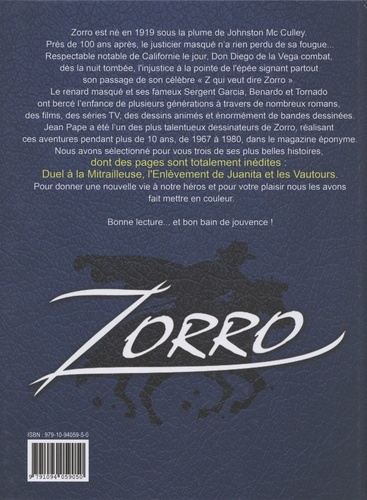 Zorro est né en 1919 sous la plume de Johnston Mc Culley. Près de 100 ans après, le justicier masqué n'a rien perdu de sa fougue... Respectable notable de Californie le jour, Don Diego de la Vega combat, dès la nuit tombée, l'injustice à la pointe de l'épée signant partout son passage de son célèbre "Z qui veut dire Zorro". Le renard masqué et ses fameux Sergent Garcia, Benardo et Tornado ont bercé l'enfance de plusieurs générations à travers de nombreux romans, des films, des séries TV, des dessins animés et énormément de bandes dessinées. Jean Pape a été l'un des plus talentueux dessinateurs de Zorro, réalisant ces aventures pendant plus de 10 ans, de 1967 à 1980, dans le magazine éponyme. Nous avons sélectionné pour vous trois de ses plus belles histoires, dont des pages sont totalement inédites : Duel à la Mitrailleuse, l'Enlèvement de Juanita et les Vautours. Pour donner une nouvelle vie à notre héros et pour votre plaisir nous les avons fait mettre en couleur. Bonne lecture... et bon bain de jouvence !